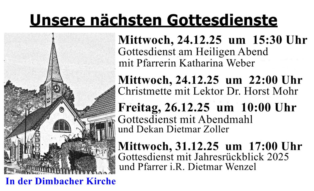Ich wünsche Ihnen und Ihren Lieben auch im Namen des Gemeinderates Dimbach erholsame und besinnliche Weihnachten und einen guten Jahreswechsel. Wir wünschen Allen Mut und Zuversicht für das Neue Jahr 2026 bei bestmöglicher Gesundheit.